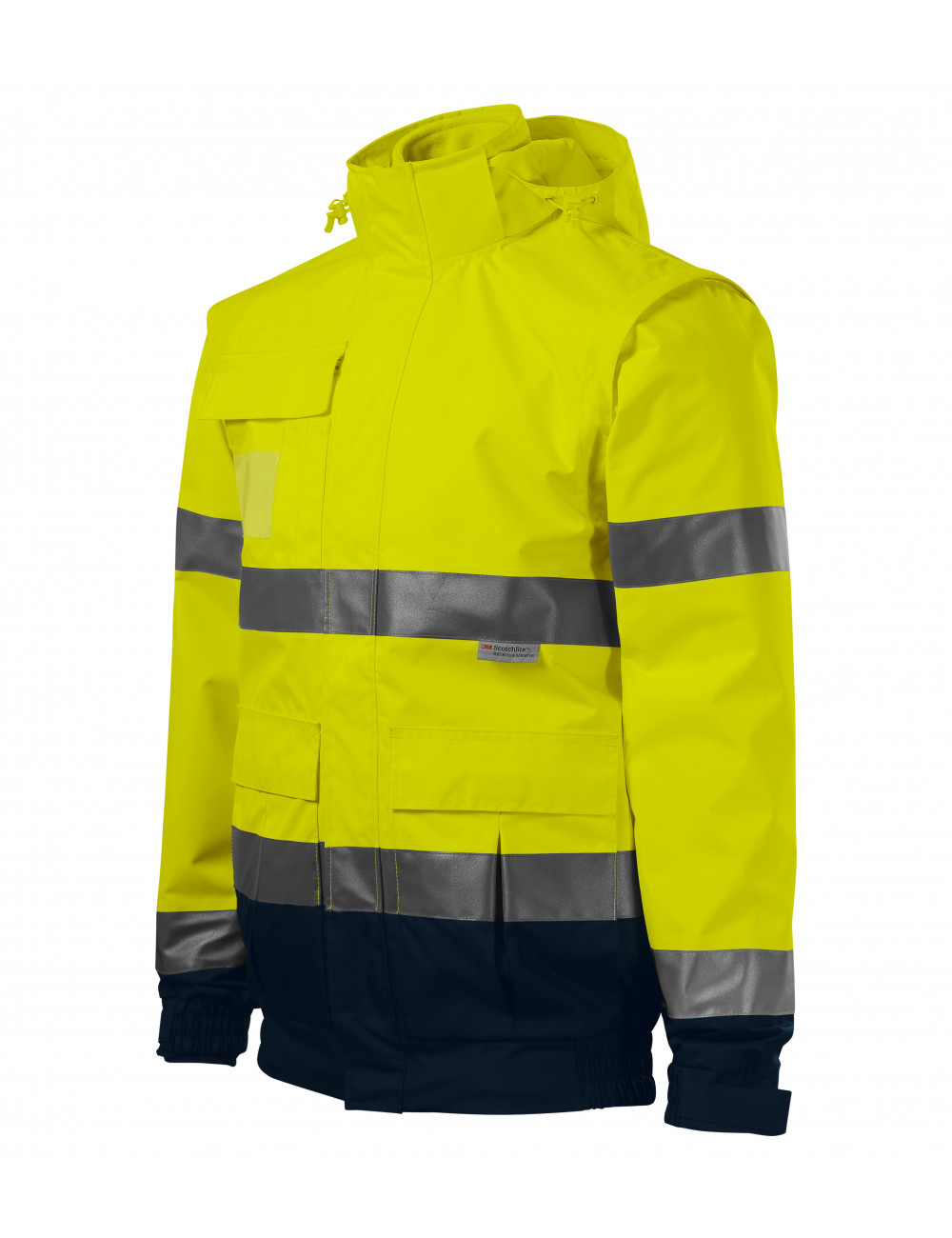 W ofercie posiadamy również kurtkę odblaskową z możliwością odczepienia rękawów oraz kaptura, co się szczególnie przydaje w okresach przejściowych oraz wszędzie tam gdzie praca wymaga zmian otoczenia i temperatur. Kurtka posiada odpinaną wewnętrzna kurtkę polarową, certyfikowane paski odblaskowe 3M, spełnia normy EN ISO. Produkt nadaje się do personalizacji, jednak przez liczne szwy i kieszenie, powierzchnia znakowania jest ograniczona, dostęp do brandingu znajduje się w tylnej części.